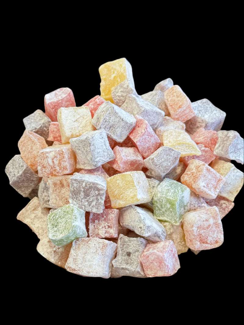 A delightful traditional dessert with a hint of pomegranate, orange, lemon, mint, and rose that is handmade in Turkiye. A delightful, bite-sized treat, they are soft, sweet, and sprinkled with the ideal amount of powdered sugar. Our state-of-the-art, sanitary, closed-environment factory produces all of our Turkish treats using fresh corn starch.