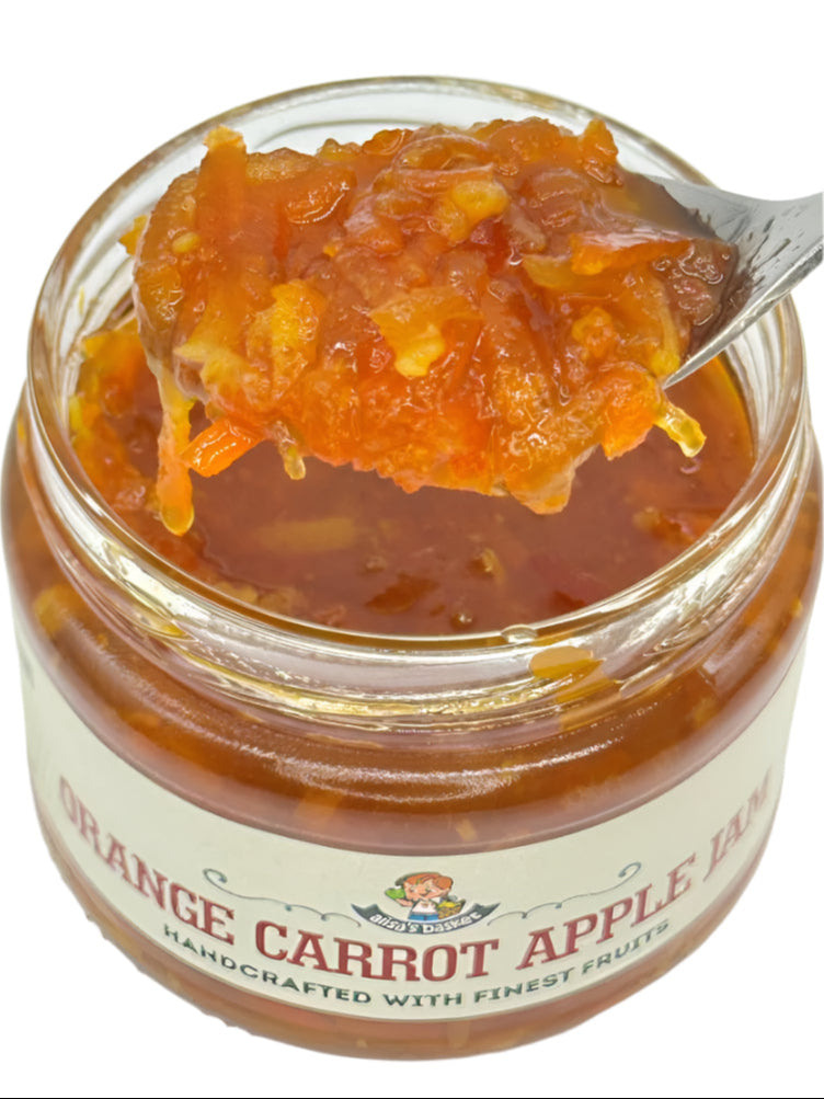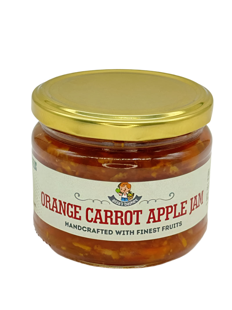 The finest, hand-picked fruits are used to make our orange-apple-carrot jam, which delivers the season's deliciousness to your tables. The stem ginger tempers the acrid orange zest with a soothing warmth. produced in small quantities to guarantee consistency and superior goods. Our jam recipes don't contain pectin, so there are no thickeners, and the fruit is suspended in syrup, maintaining its delicious syrupy character.
